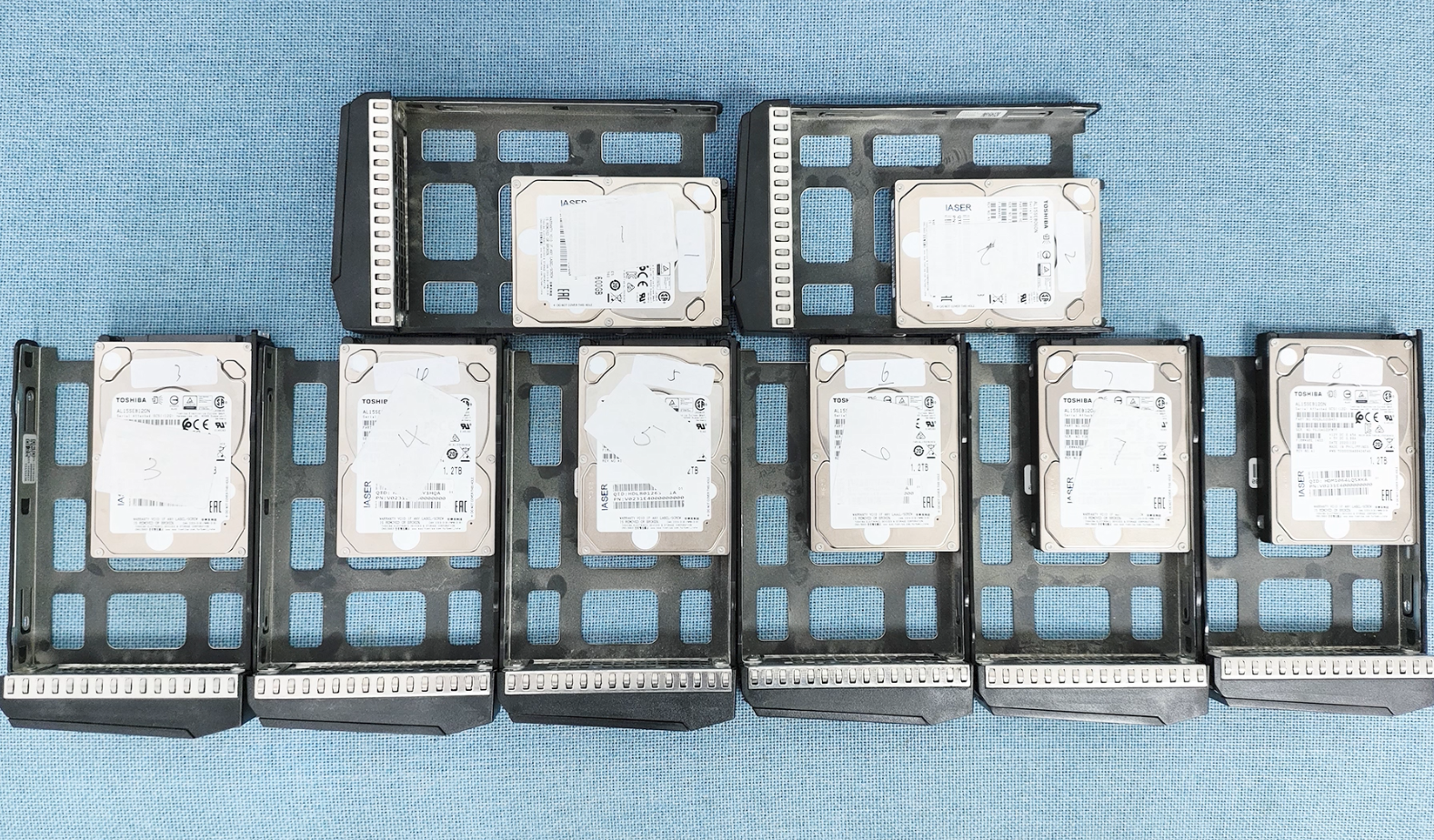 第二天一大早客户坐动车把硬盘送到杭州数据恢复中心来处理,发现是东芝2.5寸的SAS机械硬盘,经过检测是2块600G硬盘组的raid1阵列,6块1.2T硬盘组的raid5阵列。虚拟机被误删除后,又新建了一个新的同名虚拟机,还安装了系统,配置了磁盘。客户取出硬盘前先做了数据迁移备份,但完成后把里面几乎原来所有其他虚拟机删掉了。这样貌似数据是安全了,但对于我们来说存在很多删除的虚拟机,分析起来会有很多干扰。