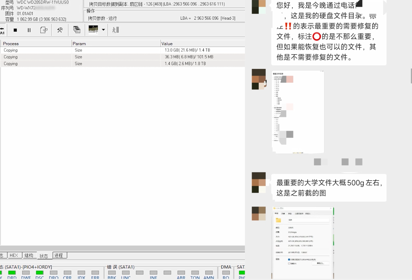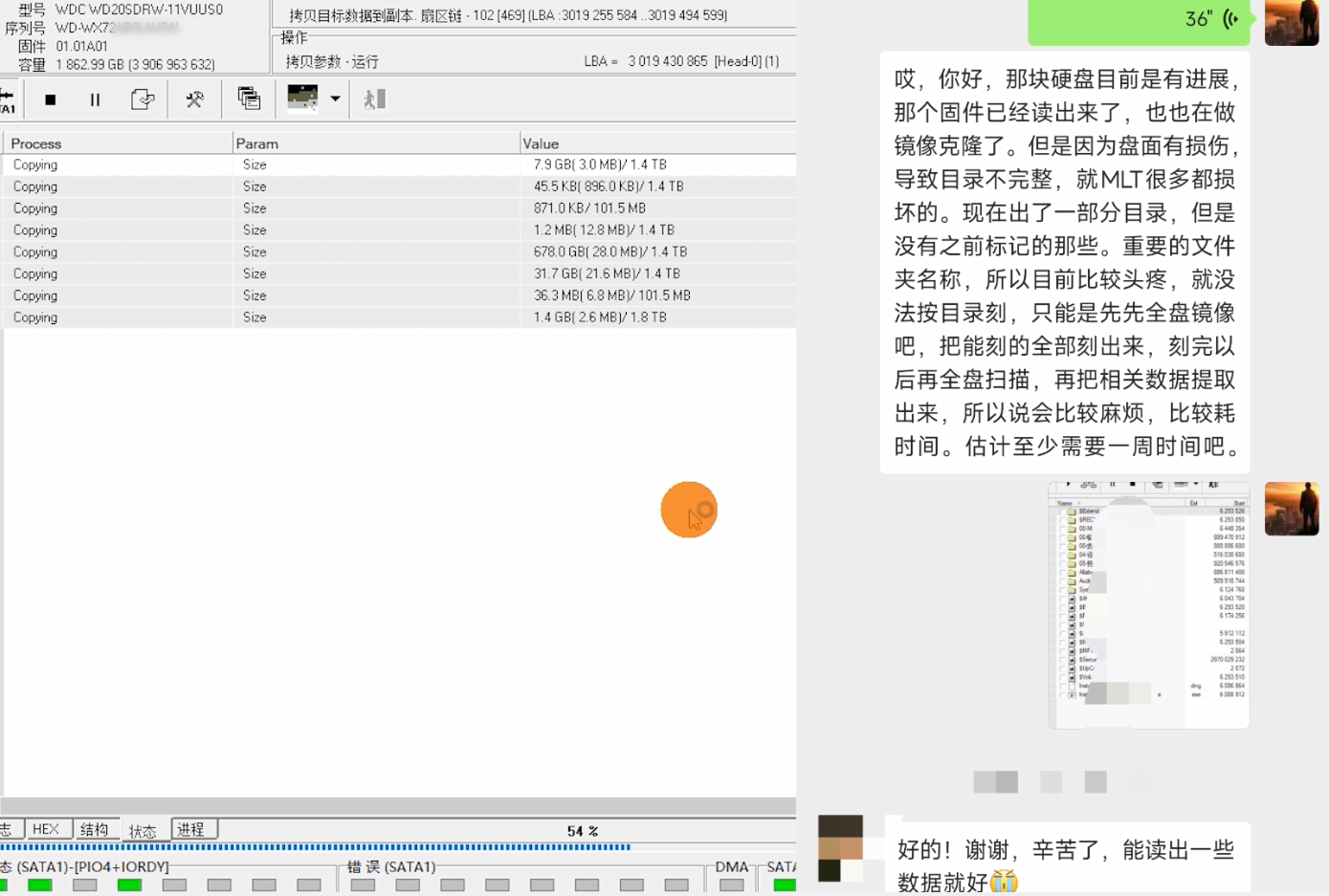 经过技术处理把重要的固件模块修复好后,建立任务做镜像克隆时很多位置刻不了,而且很容易打坏磁头,盘片有暗伤,后期经过对盘片的反复处理和各种技术尝试,大部分位置终于可以正常做镜像了,历时两个多星期的努力,成功恢复了90%以上的数据,客户近几年的学习资料以及毕业论文等绝大部分数据都恢复出来了。